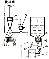 工作時,液壓泵6將切削液從儲液箱7內抽出并壓入第一級渦旋分離器5內,使切削液中10~25μm的雜質被分離出來,然后充滿整個密封箱4內并產生高壓。當壓力達到一定值時,切削液被壓入到第二級渦旋分離器) 內,進行精濾凈化處理,并將5~10μm的細小微粒分離出來。經過上述凈化處理后的切削液可輸向機床工作區使用。而使用過的含雜質較多的切削液,以及從渦旋分離器2和5中產生的沉淀物則通過接收器12的錐體流入到過濾箱11內。經過磁性分離器10,將其中含有切屑的雜質進行初步處理,然后再流回到儲液箱7。使用中,如需暫時切斷切削液的供給,只要關閉控制閥,切削液就會通過溢流閥3而流回儲液箱7內。