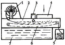 重力式紙帶過濾裝置 圖2所示為重力式紙帶過濾裝置,它以水基來凈化切削液。來自機床的污液回送至過濾裝置中帶漏網的托盤! 內并流到過濾紙上,而過濾紙座落在鋼絲網上,后者由鏈輪鏈條根據發令器(浮子開關)3的信號而移動。屑渣和浮油沉積在紙帶上,而凈化的切削液在重力作用下將滲透過濾紙,進入到下面的凈液箱7中。當過濾紙的毛細孔被屑渣或油污漂浮物堵塞時,過濾能力下降,過濾紙上的液面將會升高,抬起浮子3接通發令器信號,啟動鏈輪電機,帶動過濾紙移動一段距離(200~400mm),于是新的過濾紙就參加工作,紙帶上液面很快下降,浮子復位,過濾紙帶的移動停止,與此同時粘附有屑渣的過濾紙則掉入到污紙箱5內。這種凈化裝置已有專業廠生產,過濾精度主要取決于所使用的濾紙密度,其流量有25、50、75、100、150、200L/min等多種規格。
