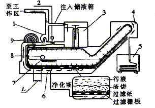 負壓式紙帶過濾裝置 圖3所示為負壓式紙帶過濾裝置。來自機床的污液經入口8注入過濾箱7內,在重力作用下經過濾紙漏入柵板底下的負壓室6內,而懸浮的污物則截留在紙帶上。啟動液壓泵1,將凈化切削液的大部分抽送至工作區,小部分輸入儲液箱。當凈液抽出后,負壓室6內的液面下降,并產生真空,從而可提高過濾能力與效率。待紙帶上的屑渣聚積到一定厚度時,形成渣餅,此時過濾速度下降,即使在負壓下過濾下來的液體仍漸漸少于抽出的液體,使室6內的液面不斷下降,負壓增大,待負壓大至一定數值時壓力傳送器便發出信號,打開儲液箱3下面的閥,由儲液箱放液進入負壓室6。當注滿負壓室時,裝有刮板的傳動裝置! 開始啟動,帶動過濾紙9移動一段距離(200~400mm),使新的過濾紙開始過濾,于是過濾速度加快,儲液箱下面的閥關閉,進入正常過濾狀態,繼續下一個負壓過濾工作循環。使用表明,這種裝置毋需用專門的真空泵就能自然形成負壓,是一種較好的切削液過濾凈化裝置。